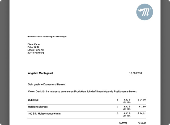 Keine Experimente mehr mit der Textverarbeitung oder der Tabellenkalkulation. Angebote werden von alfons genauso unkompliziert und einheitlich ausgegeben, wie Briefe und Rechnungen.