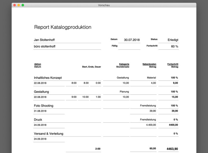 Ideal zum Beispiel für alle, die auf Stundenbasis arbeiten. Den Kern eines Reports bilden beliebig viele Etappen, die aus Tätigkeiten, Zeiteinheiten oder auch aus anderen Kosten bestehen können. So behalten Sie im Überblick, ob ein Projekt rentabel bleibt und was aktuell zu tun ist.